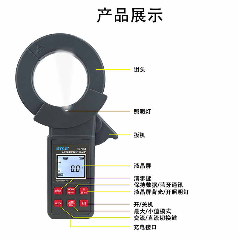 ETCR6670D大口徑直流/交流鉗形電流表鉗表具有直流/交流真有效值測量、最大值/最小值/平均值測量等功能。鉗表具有數據保持、藍牙通訊功能,使用大容量鋰電池type-c充電口,是一款新型的電工安全檢測必備工具。
