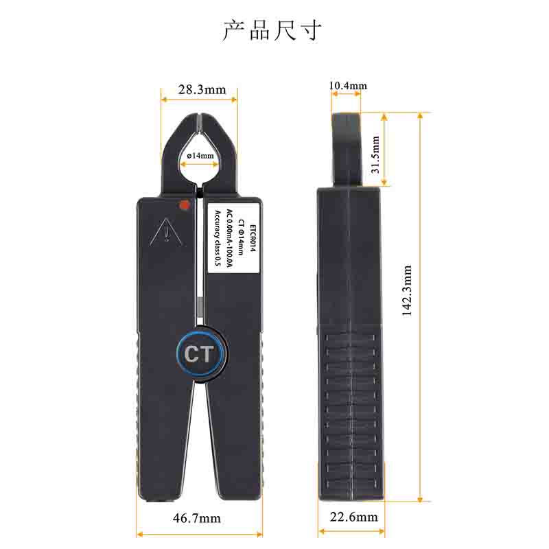 ETCR014V (電壓型) | ![]() | 量程:0.00mA~100A AC 精度等級:1.0 相位誤差:≤2° 變比:1A/10mV 工作頻率:10Hz~100kHz | Ф14mm | 142mm×46.7mm×22.6mm | 194g |