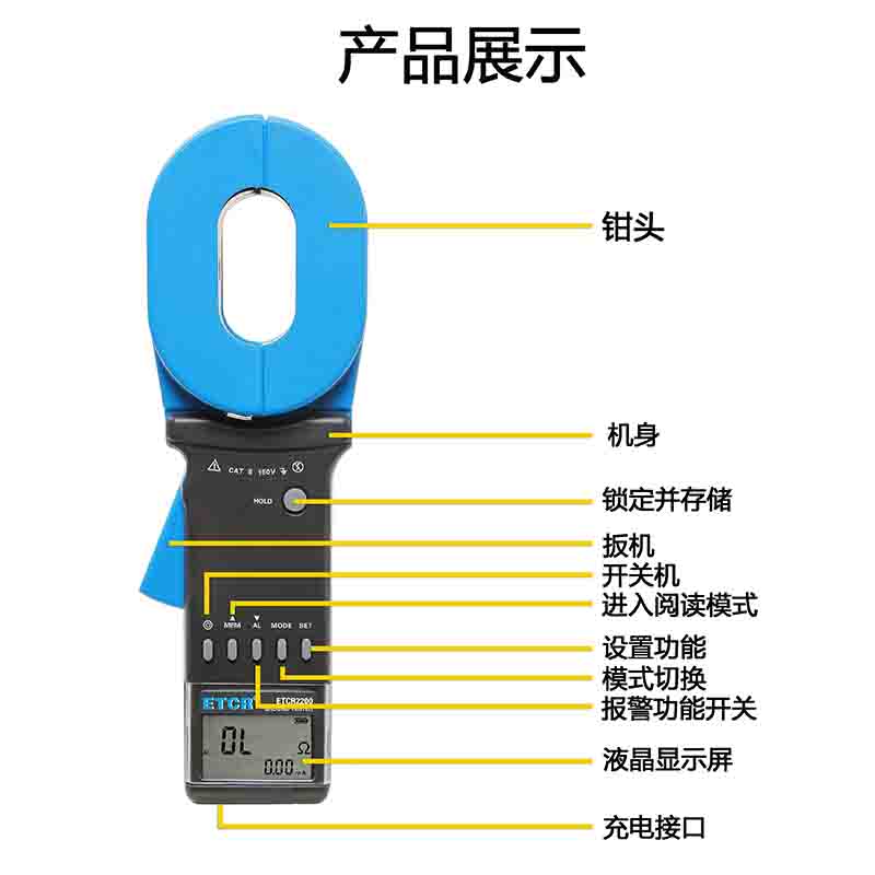 ETCR2200高端多功能鉗形接地電阻測試儀能測量出用傳統方法無法測量的接地故障,能應用于傳統方法無法測量的場合,因為鉗形接地電阻儀測量的是接地體電阻和接地引線電阻的綜合值。