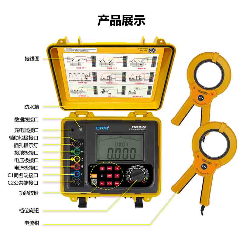 ETCR3200C雙鉗接地電阻測試儀,由主機、電流鉗(雙鉗)、數據軟件、測試線、輔助接地棒、通訊線等組成。儀表采用大口徑電流鉗設計,可應對各種場合的測試需求,可測量大尺寸接地引下線的接地電阻值,主機超大LCD顯示,具有背光、棒圖指示,一目了然。儀表具有支持安卓系統的藍牙通訊功能,安裝APP后可在移動終端進行測試或讀取測試記錄,給你帶來全新體驗。儀表具有存儲功能,時鐘功能,自動存儲含有日期時間的測試結果2000組。通過USB接口數據軟件可以實現歷史數據讀取、查閱、保存、報表、打印等功能。
