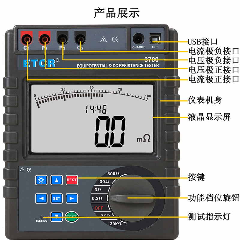 | ETCR3700C等電位聯結電阻測試儀 | 1mΩ~30.0kΩ | 0.3Ω、3Ω、30Ω、300Ω、3kΩ、30kΩ | 4A MAX | 可設置電阻報警閾值 | 400組 | —— |