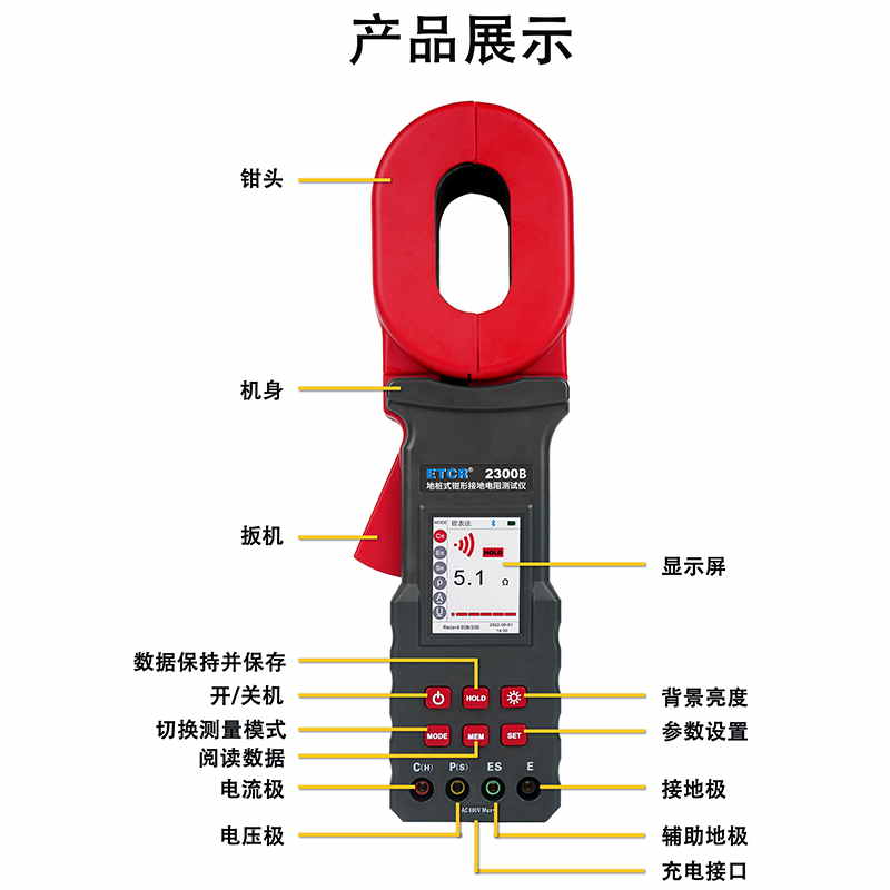 ETCR2300B地樁式鉗形接地電阻表采用大口徑電流鉗設計,可應對各種場合的測試需求,可測量大尺寸接地引下線的接地電阻值,可測量單點和網狀接地等各種復雜接地結構的接地電阻值,測量并聯接地系統時無需斷開任何并聯接地極,極大地提高了測量的方便性,為接地性能測試提供了完美的解決方案。