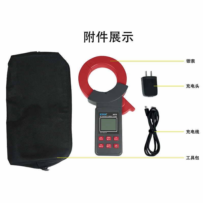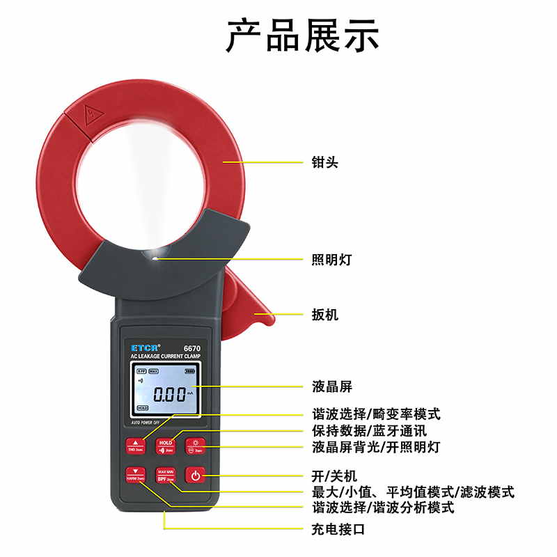 ETCR6670鉗形漏電流表可測試40Hz~1kHz頻率范圍的電流。鉗表還具有背光、手電筒、數據存儲、藍牙通訊等功能。鉗表使用大容量鋰電池type-c充電口,是一款新型的電工安全檢測必備工具。
