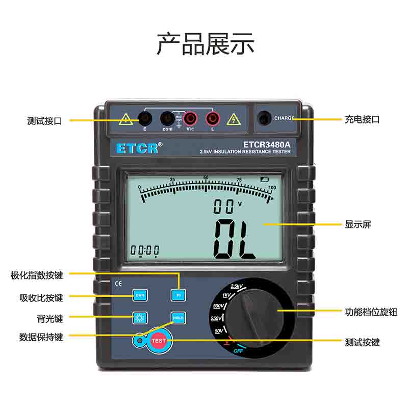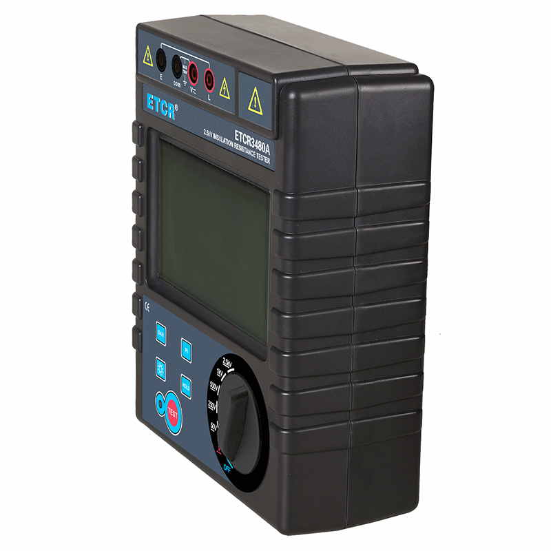 ETCR3480A絕緣電阻表又名兆歐表、絕緣電阻測試儀,用于絕緣電阻測試、吸收比、極化指數(shù)測試、交直流電壓測試。儀表具有LCD大屏幕帶背光顯示、數(shù)據(jù)保持、自動放電、自動關(guān)機(jī)等功能。儀表具有測試計時,電壓監(jiān)測功能,回路電壓大于36V時,儀表將禁止測試以保護(hù)被測物及人員安全。儀表功能操作簡易,絕緣電阻值,測試時間,輸出電壓同屏顯示,具備交流電壓、直流電壓測試功能。
