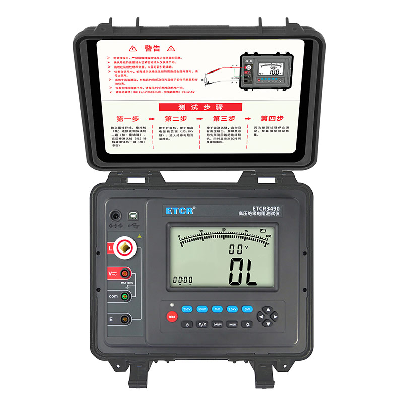 ETCR3490系列高壓絕緣電阻測(cè)試儀又名兆歐表、絕緣電阻測(cè)試儀等,用于絕緣電阻的測(cè)試。本儀表是一款高性能數(shù)字式儀表,具有LCD大屏幕帶背光顯示、數(shù)據(jù)保持、自動(dòng)放電、自動(dòng)關(guān)機(jī)等功能。儀表具有測(cè)試計(jì)時(shí),電壓監(jiān)測(cè)功能,回路電壓大于36V時(shí),儀表將禁止測(cè)試以保護(hù)被測(cè)物及人員安全。儀表功能操作簡(jiǎn)易,絕緣電阻值,測(cè)試時(shí)間,輸出電壓同屏顯示,同時(shí)還具備吸收比、極化指數(shù)測(cè)試、交流電壓、直流電壓測(cè)試功能。