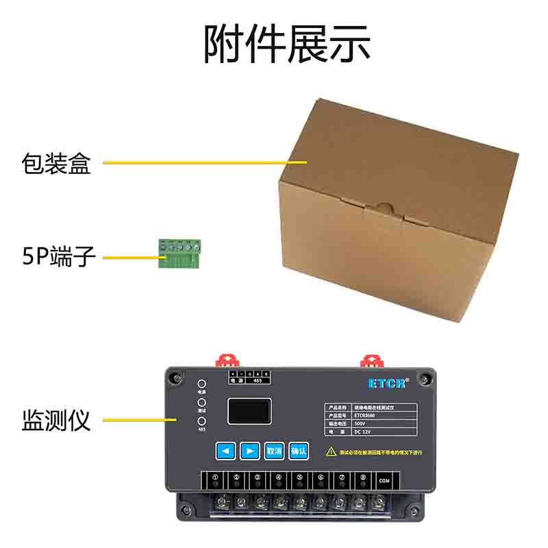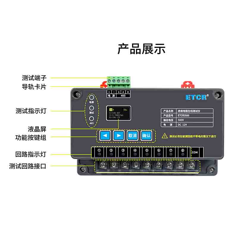 | ETCR3580C絕緣電阻在線監(jiān)測儀 | 50V、100V、250V、500V、1000V (自定義) | 0.1MΩ~20GΩ | 5mA MAX | 1路 | RS485 |
