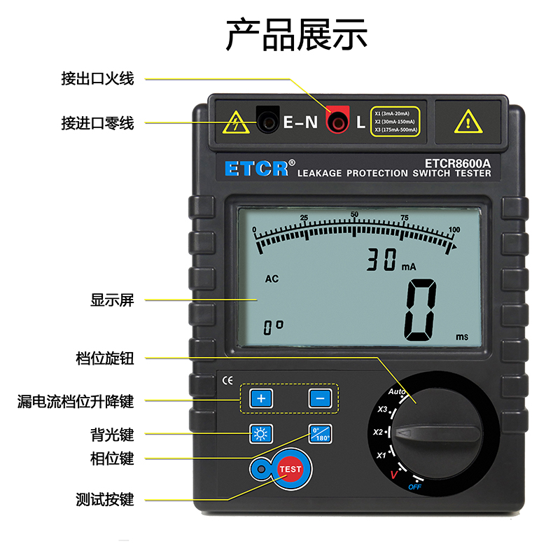 ETCR8600A漏電保護器測試儀采用超大LCD顯示,白屏背光,棒圖指示。輸出電流、動作時間、電池電量、相位同屏顯示,具有自動關機、設定故障電壓指示、相位選擇、背光選擇、數據存儲等功能,儀表操作簡便,精度高、體積小、重量輕、外觀精致,便于攜帶,是各種漏電保護器現場或室內檢測的理想工具。