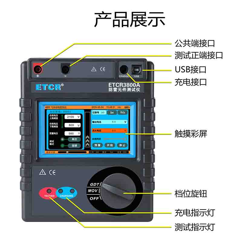ETCR3800A智能型防雷元件測試儀又稱防雷元件測試表、SPD現場測試儀、壓敏電阻測試儀、浪涌保護器測試儀,用于測量各種壓敏電阻(MOV)、氣體放電管(GDT)、浪涌保護器(SPD)性能參數測試,儀表具有獨特的高壓短路保護、過流保護功能,專業級的參數設置功能、高壓限值設定、升壓速度設定、合格范圍設定、合格判斷篩選、自動量程調節等功能。還具有單件測試模式、連續測試模式功能,特別適合批量元件測試。儀器廣泛用于避雷器、防雷器、浪涌保護器、壓敏電阻、金屬陶瓷放電管、真空避雷管等過壓防護元件性能參數的測試。是氣象防雷、電力、通信、機電安裝和維修、防雷元件生產廠家、以及工業企業部門常用必備的儀表。
