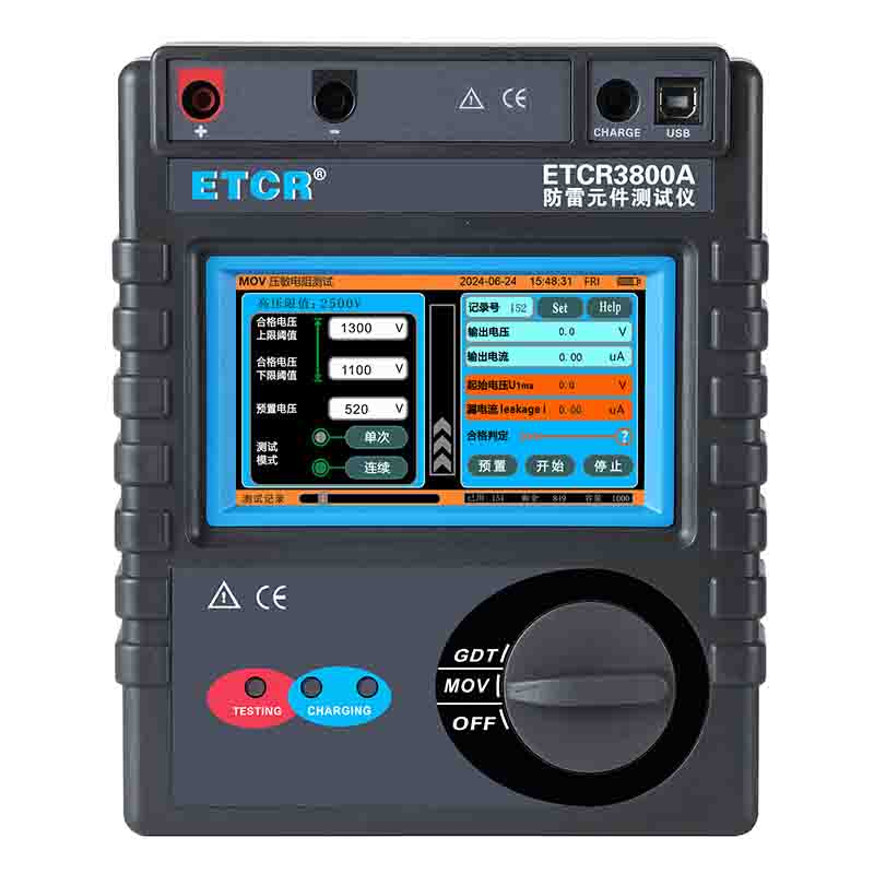 ETCR3800B智能型防雷元件測試儀又稱防雷元件測試表、SPD現場測試儀、壓敏電阻測試儀、浪涌保護器測試儀,用于測量各種壓敏電阻(MOV)、氣體放電管(GDT)、浪涌保護器(SPD)性能參數測試,還具有絕緣電阻、吸收比、極化指數測試功能。儀表具有獨特的高壓短路保護、過流保護功能,專業級的參數設置功能、高壓限值設定、升壓速度設定、合格范圍設定、合格判斷篩選、自動量程調節等功能。還具有單件測試模式、連續測試模式功能,特別適合批量元件測試。儀器廣泛用于避雷器、防雷器、浪涌保護器、壓敏電阻、金屬陶瓷放電管、真空避雷管等過壓防護元件性能參數的測試。是氣象防雷、電力、通信、機電安裝和維修、防雷元件生產廠家、以及工業企業部門常用必備的儀表。