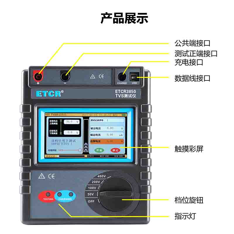 1、TVS測試儀,采用觸摸彩屏,具有電壓閾值輸入、合格判定、測試結果顯示、實時電壓電流顯示、測量記錄使用情況、電池電量顯示、測試記錄顯示及測試記錄操作。