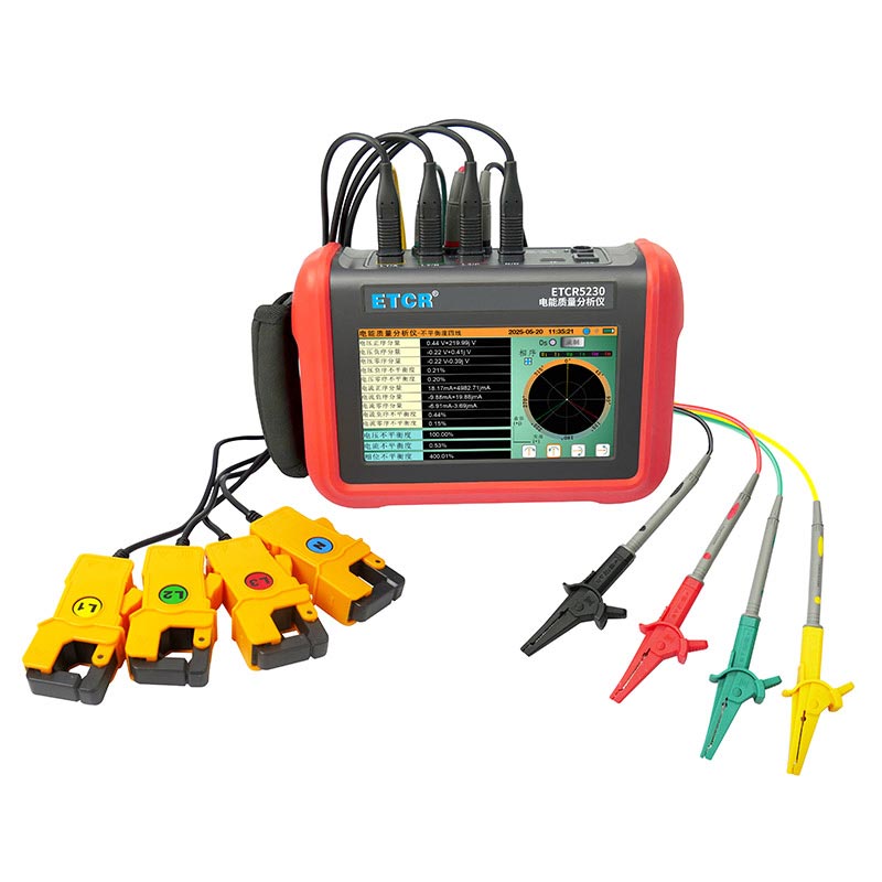 ETCR5230電能質量分析儀是我公司精心研制的一款專為現場測試三相電能質量的高精度綜合型測試儀器。儀表具有智能化、功能完善、人機操作簡潔、中英文雙語操作界面等特點。儀表采用7寸觸摸彩屏、體積小重量輕、攜帶方便,可選配多款電流鉗。儀表可同時測量4路電流(ABC三相及中性線電流),3路電壓、三相不平衡度、有功功率、無功功率、視在功率、諧波比、總諧波失真度等;顯示電流電壓的實時波形、相量圖;動態捕捉電壓電流瞬時變化,監測啟動電流,監測各電力參數并生成告警列表,長時間記錄測試數據并生成趨勢曲線圖等功能。