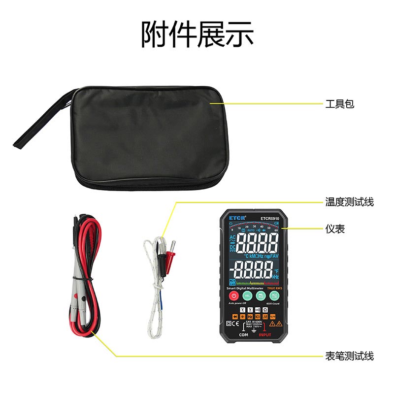 1. 便攜式6000計數(shù)自動量程數(shù)字多用表,全新設(shè)計,結(jié)構(gòu)精巧、操作容易、攜帶方便,是電工電子測量之理想工具。