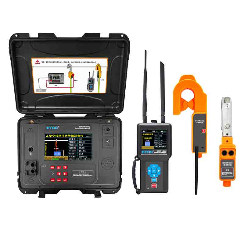 ETCR1400C架空線路接地故障巡查儀,可進行多條線路的接地故障定位。在架空線路停運后,由高壓發射端向線路施加低頻高壓信號,電流檢測鉗檢測電纜線的信號,通過主機分析脈沖電流及阻抗,判斷有無接地故障,在接收機液晶屏顯示及語音播報檢測結果。