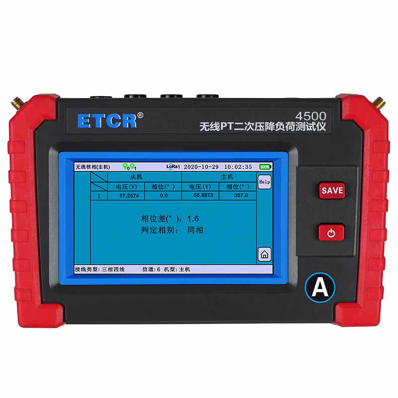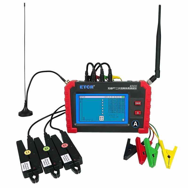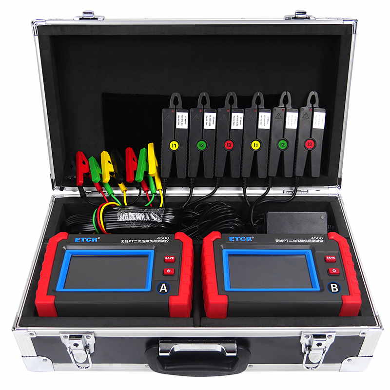 ETCR4500無線PT壓降負荷測試儀又稱PT核相儀、PT負荷測試儀、PT比差測試儀,用于現(xiàn)場在線測試電能計量裝置電壓互感器(以下簡稱 PT)的二次回路壓降,以及PT核相、PT負荷測試、CT負荷測試、三相伏安表、諧波分析等。儀表由2臺手持終端、6個電流鉗、2組電壓測試線等組成,2臺手持終端具有無線通訊及GPS通訊,可互設為主機或從機,實現(xiàn)同步測量變電站內(nèi)不同位置之間電流、電壓、相位等參數(shù)。